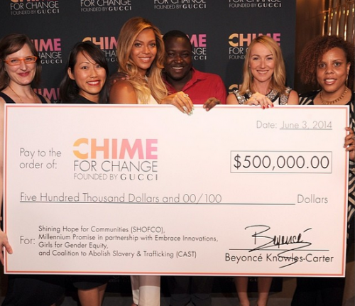 Beyonce sa zúčasnila charitatívnej akcie usporiadanej pod záštitou spoločnosti Gucci pre ich charitu s názvom Chime For Change, ktorá sa zaoberá pomocou mladým ženám s ťažkým osudom. Beyoncé prispela čiastkou v hodnote 500 000 $, ktoré pochádzajú z jej vlastného "vrecka". Speváčka s touto charitou spolupracovala už skôr, napríklad minulého roku, keď vystúpila na benefičnom koncerte v londýnskom Twickenham štadióne spolu s ostatnými umelcami, ktorí sa rozhodli podporiť túto veľmi prospešnú charitatívnu spoločnosť.